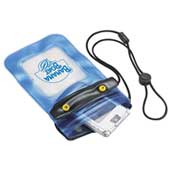 Fabricada en Plástico PET Transparente Cristal y resisitente con broche de cierre impermeable color Negro en la parte superior y jareta ajustable para colgarse al cuello.