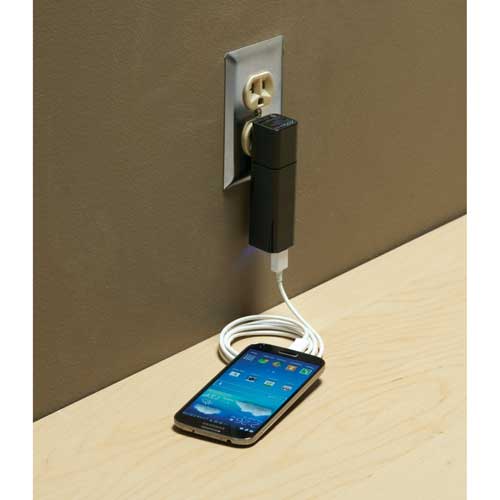 Bateria con adaptador de corriente USB. La batería se puede cargar en una computadora con el puerto USB que tiene o en el muro con el adaptador. El adaptador también se puede usar para cargar un celular directo a muro. La batería tiene un botón de encendido e indicadores LED del nivel de carga. La bateria está aprobada y cumple con los standards de UL o de ETL. Totalmente cargada la batería ofrece una carga de 3000 mAh a una velocidad de salida de 1 Amp.