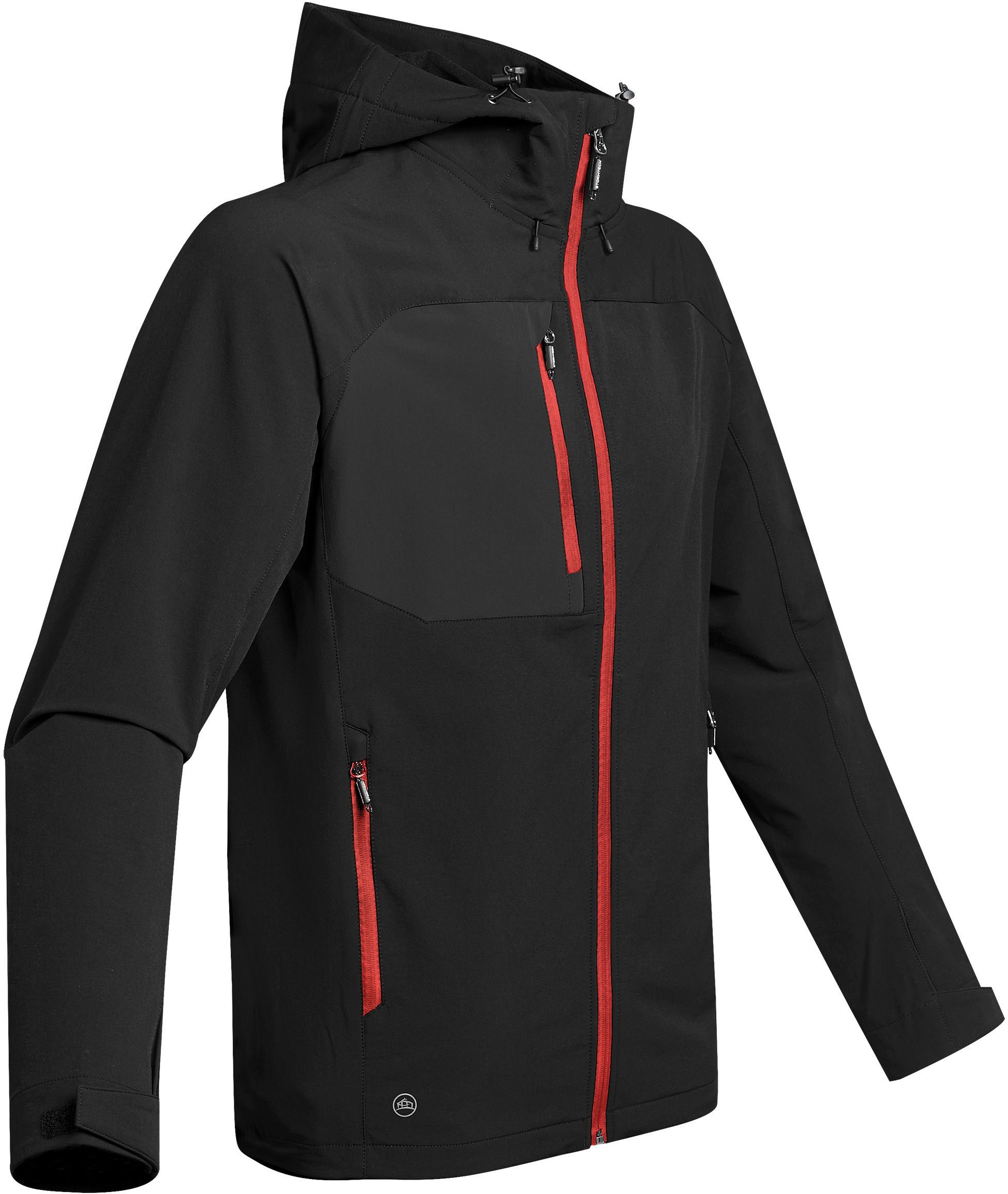 Con cierre completo al frente, dos bolsas al frente con cierre, bolsa impermeable exterior en el pecho derecho para MP3 o iPod, puños ajustables con trabilla de tela y Velcro, jareta en la cintura y gorro.