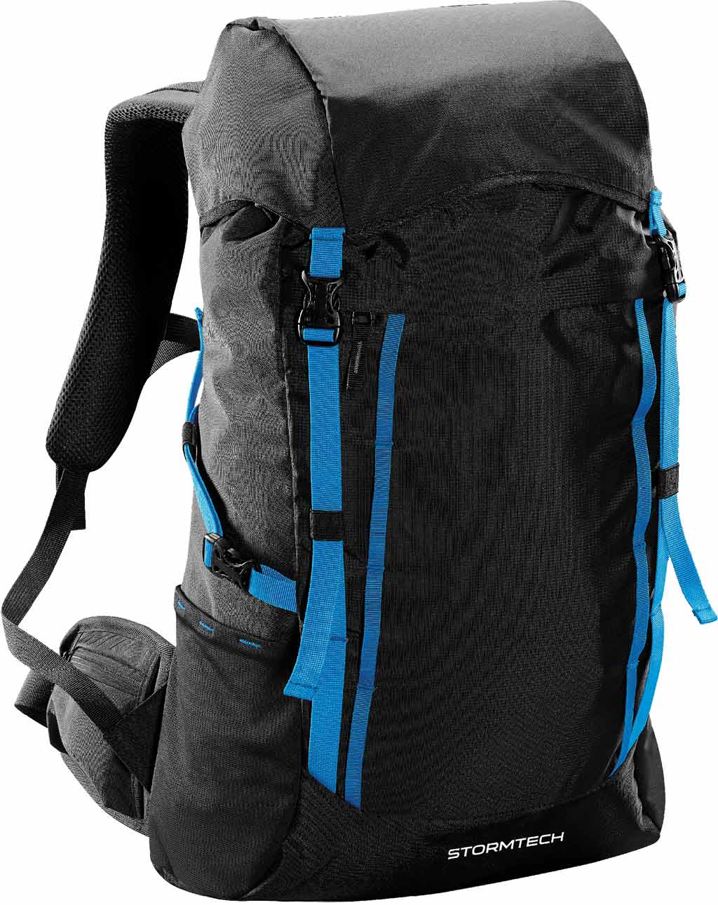 Con amplio compartimiento principal con acceso superior con jareta y cubierta protectora impermeable con bolsa, dos bolsas laterales con malla para botellas de agua. Con asa superior, espalda acojinada, refuerzo de alma de plástico para la espalda, tirantes laterales ajustables, tirantes acojinados y ajustables para cargarse, y cinto con bolsas con cierre.