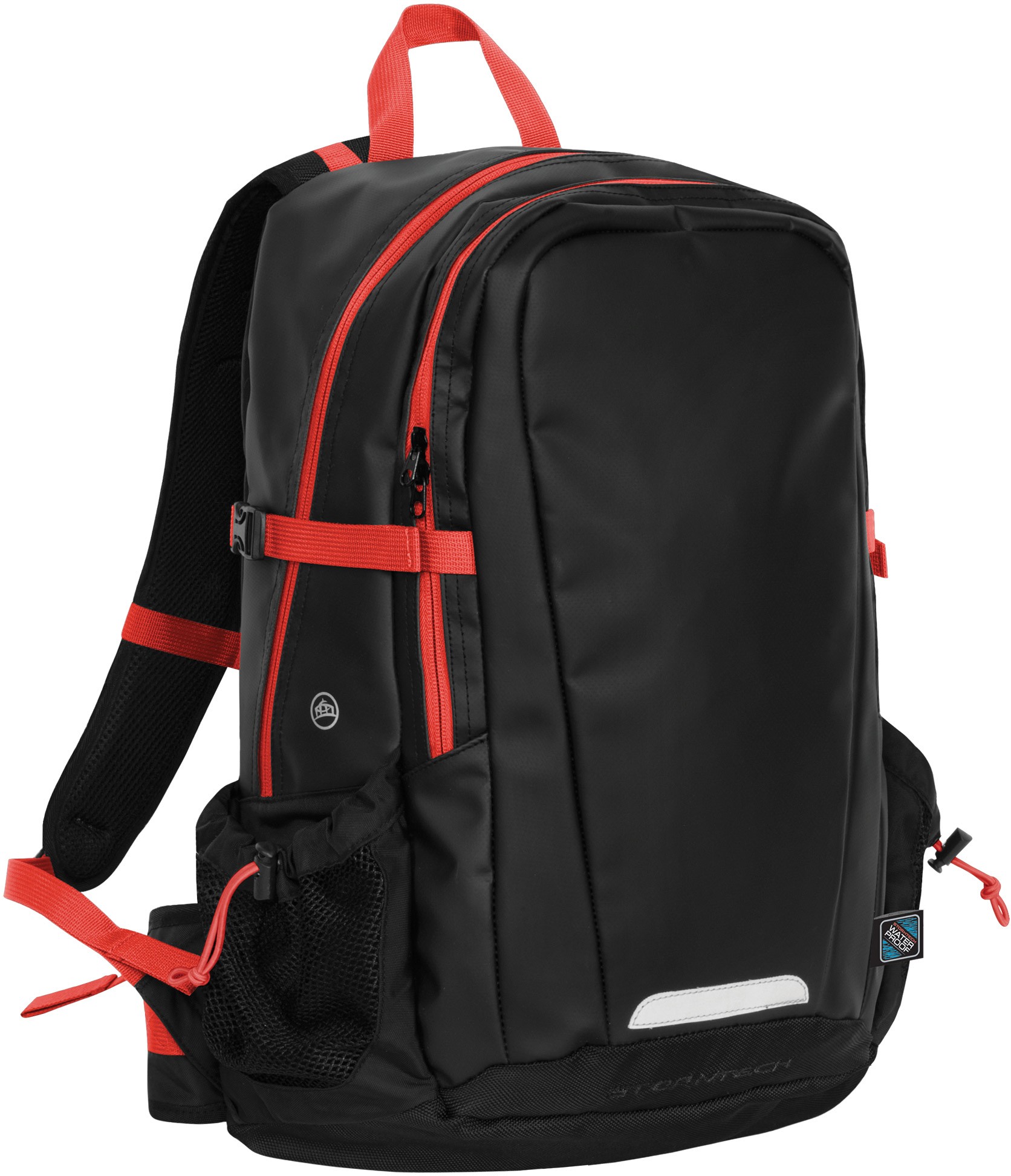 Back Pack fabricada en 100% PVC 100% Polyester 1680D color Negro con detalles y cierres en color Rojo, Azul Rey o Gris, y banda reflejante de seguridad.
